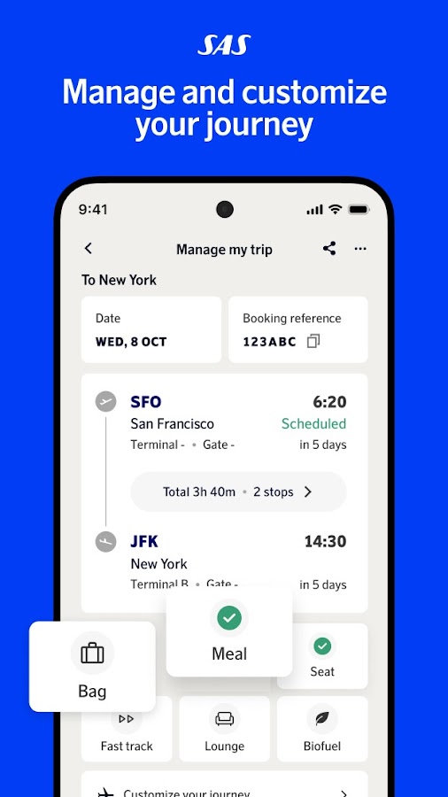 Приложение SAS — незаменимый помощник и компаньон в путешествии, который информирует вас о вашем рейсе и напоминает, когда пора регистрироваться и садиться.
