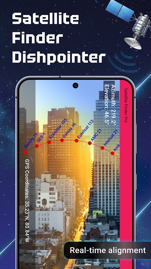 Максимальная точность при наведении антенны!Дополненная реальность в Satellite Finder Pro (Dishpointer) позволяет максимально точно выровнять спутниковую антенну. Вы можете с легкостью направить свой телефон в небо и точно знать, где заблокированы спутники. Мало того, что система имеет встроенный компас, гирокомпас графически показывает угол азимута, что означает, что пользователь полностью контролирует направление антенны.