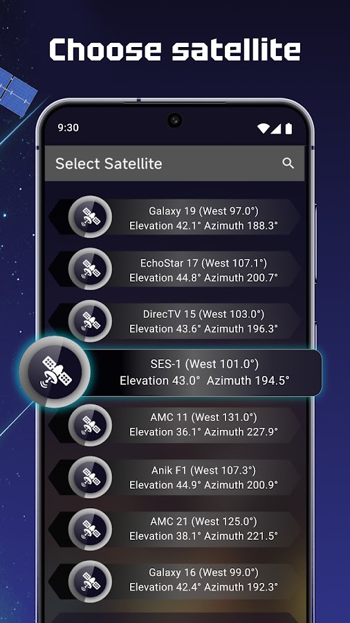 Это приложение спутникового поиска использует датчик вашего телефона для определения азимута, поэтому расчет положения спутника зависит от точности ваших мобильных датчиков.