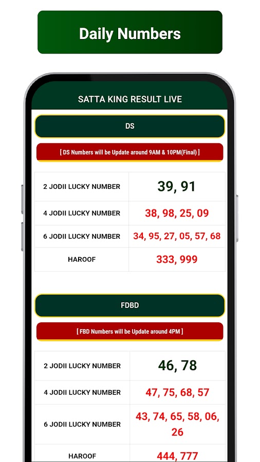 Satta King Result Live (सट्टा किंग रिजल्ट लाइव) поможет вам быть в курсе последних быстрых результатов, обновлений результатов в режиме реального времени и ежедневных тенденций чисел для популярных рынков, таких как Дисавар, Гали, Фаридабад, Газиабад, Дели и Уттар-Прадеш.