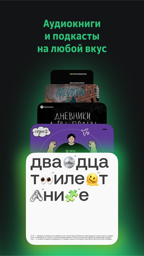 Хит-парад треков, чарты и развлекательное аудио, уникальные плейлисты и эксклюзивные подкасты для любого настроения и ситуации нота за нотой подарят вам уникальный пользовательский опыт в аудиосервисе Звук, даже если вы меломан.