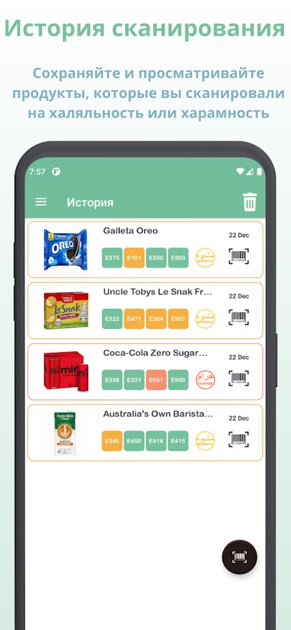 Все отсканированные продукты будут сохранены, чтобы вы могли снова их проверить или поделиться с близкими. Одним кликом вы сможете сообщить, какие продукты являются Халал (حلال), Харам (حرام) или Макрух (مكروه).