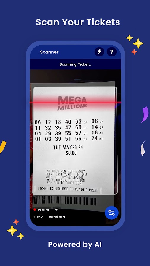 *Работа сканера может различаться в зависимости от штата. В настоящее время сканер отлично работает в большинстве штатов, включая Аризону, Огайо, Нью-Йорк, Техас, Пенсильванию, Джорджию, Северную Каролину и Нью-Мексико. Мы работаем над улучшением сканера в Калифорнии, Флориде и Вашингтоне. В этих штатах сканер должен работать с билетами с 1–5 линиями. Это идеальное лотерейное приложение для игроков из Нью-Йорка, Техаса, Кентукки и Флориды, позволяющее им проверить свои билеты Powerball и MegaMillion.
