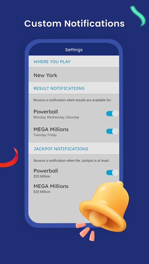 Будьте в курсе последних результатов Powerball и сумм джекпотов. Установите напоминание об игре с учетом желаемого размера джекпота.