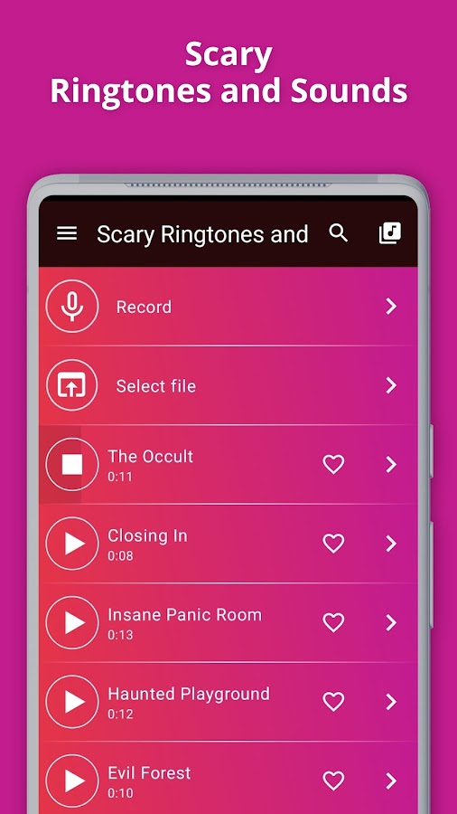 Хотите иметь страшный звук в качестве персональные рингтоны на телефон? В Страшные Рингтоны на Звонок бесплатное приложение для Андроид вы найдете страшные звуки ужасов на звонок который можно установить в качестве мелодии на телефон!