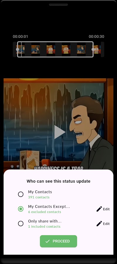 Настройте, кто может просматривать ваш статус: выберите весь список контактов, включите определенные контакты или исключите несколько.