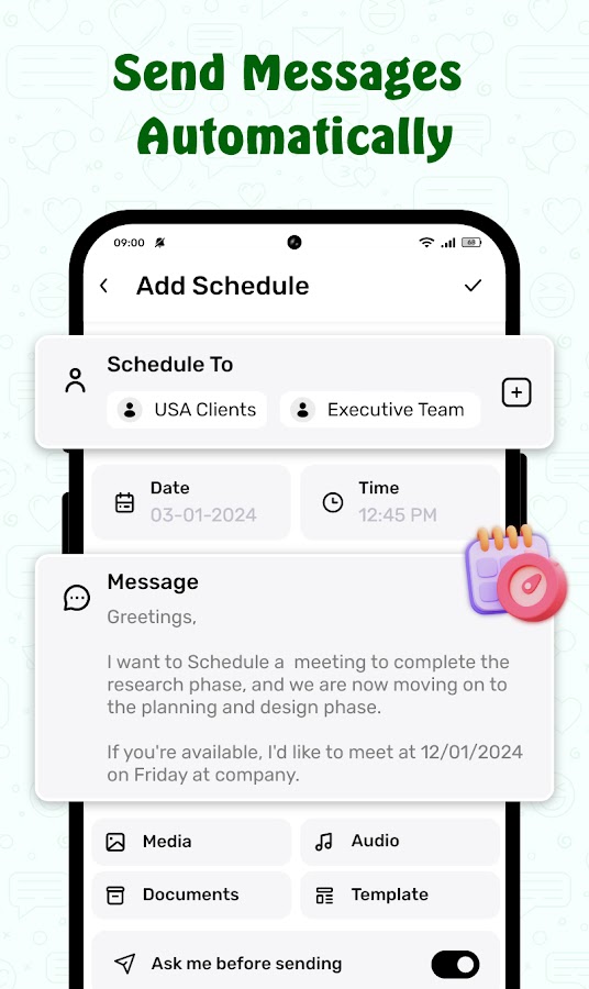 ScheduleUP разработан с учетом эффективности бизнеса, предлагая удобный интерфейс, который упрощает планирование сообщений! Независимо от того, отправляете ли вы напоминания о работе своей команде, продвигаете продукты клиентам, отправляете поздравления с днем рождения или отслеживаете важные задачи, ScheduleUP гарантирует быструю доставку ваших сообщений.