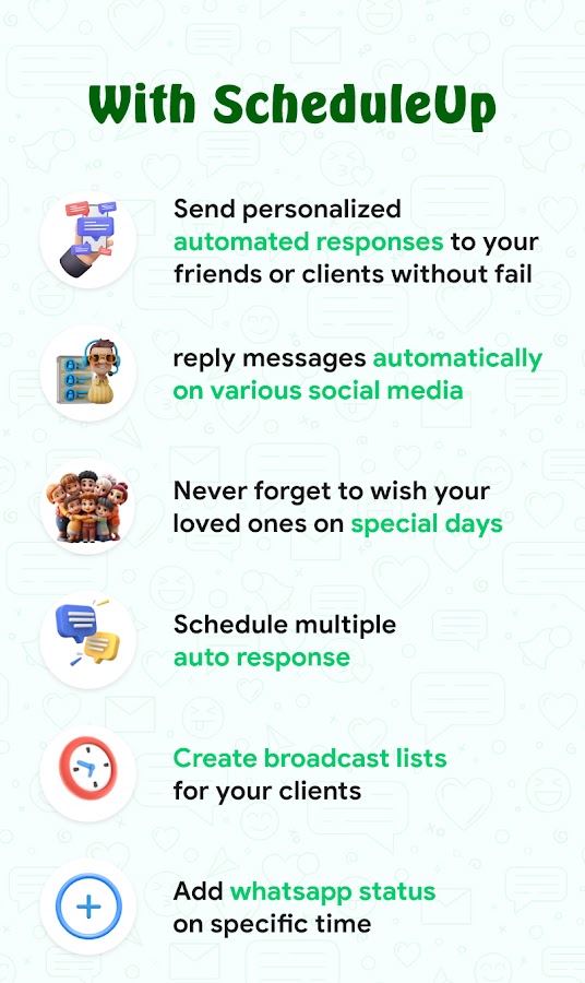 Повысьте производительность своего бизнеса с ScheduleUP! Наше комплексное приложение WhatsApp Scheduler и Autoresponder упрощает планирование сообщений в WhatsApp, WhatsApp Business, Telegram, SMS и FB Messenger. Планируете ли вы рекламные сообщения, автоматизируете взаимодействие с клиентами или обеспечиваете своевременные ответы, ScheduleUP позволяет вашему бизнесу эффективно взаимодействовать и максимизировать производительность.