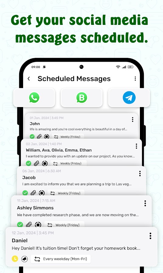 🟢 Автоматическое планирование сообщений: заранее планируйте и планируйте сообщения на социальных платформах, которые вы чаще всего используете для бизнеса — WhatsApp, Telegram, WhatsApp Business, FB Messenger и SMS.