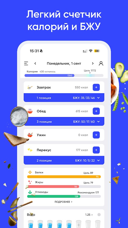 Если ваша цель — эффективно похудеть, то персональный бжу калькулятор станет незаменимым инструментом. Настраивайте цели, используйте подсчет кбжу и расчет кбжу для контроля не только макронутриентов, но и витаминов, минералов. Наш бжу счетчик поможет сбалансировать белки жиры углеводы так, чтобы ваше питание было здоровым, вкусным и разнообразным. Встроенный трекер воды и учет физической активности необходимы для правильного похудения и ускорения метаболизма. Узнайте свой ИМТ (индекс массы тела) и следите, как меняется тело и процент жира. Сбалансированный рацион и грамотный дефицит калорий помогут вам достичь результата без срывов.