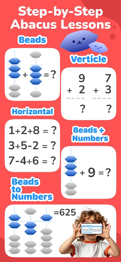 счеты — приложение для обучения детей подходит для детей от 5 лет и старше, которые знают о числах и некоторых базовых принципах сложения и вычитания.