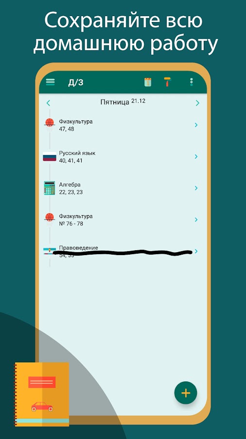 Ваше учебное заведение похоже на Хогвартс, и помнить в которое крыло школы переместиться следует после следующего урока — является настоящим препятствием? Миллион предметов, непонятный расписание с числителями и знаменателями… School решит ваши проблемы. И даже если вам никак не удается запомнить имена своих любимых преподавателей — просто внесите ваше расписание уроков, кабинеты, имена, а также домашнее задание в School. Удобно и компактно, ведь вся информация всегда в вашем смартфоне.
