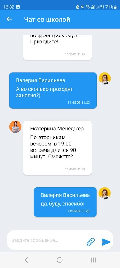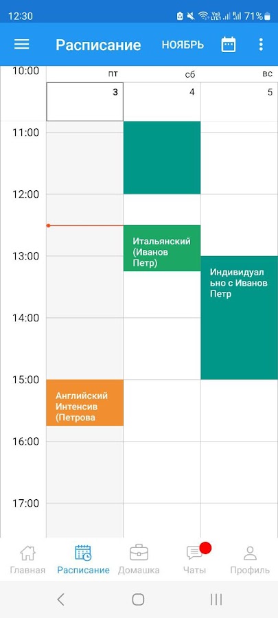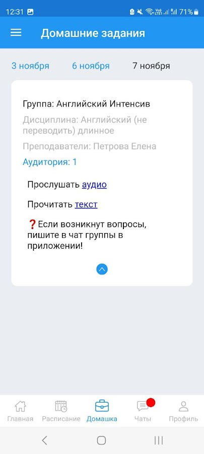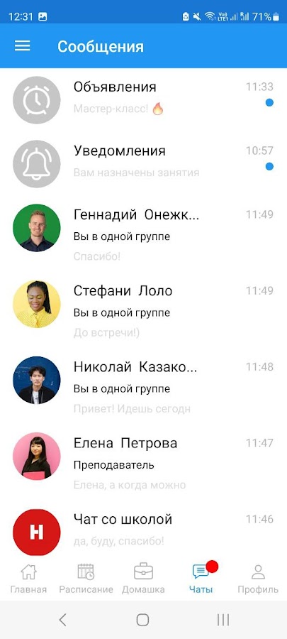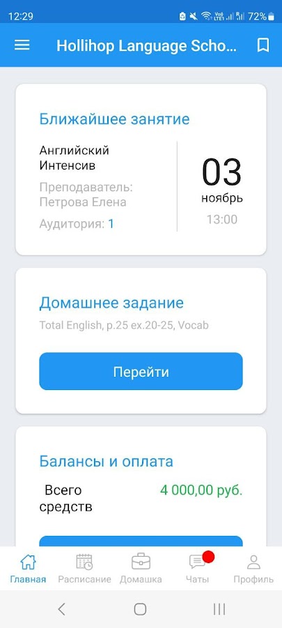 Здесь вы легко найдёте всю информацию по своим занятиям: расписание, домашние задания, оценки, результаты тестов, учебные материалы. Здесь также есть чат группы и чат с преподавателем/менеджером учебного центра.