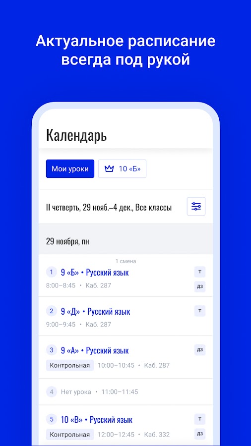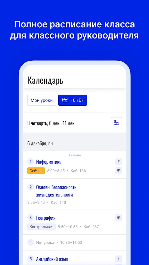 — Просматривать расписание класса, в котором учитель является классным руководителем;