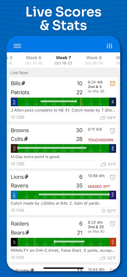 — Полная статистика NFL для каждой игры: пасы, выносы, приемы, защита и многое другое.