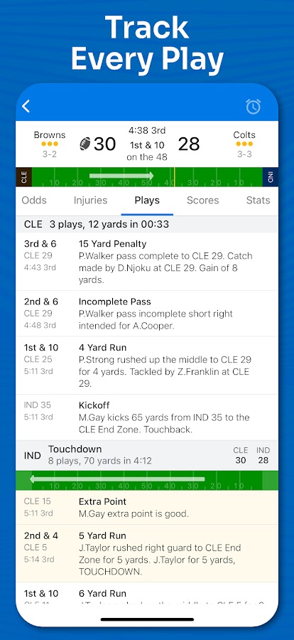 — Мгновенные обновления результатов NFL с молниеносными уведомлениями о тачдаунах, розыгрышах в красной зоне и напряженных матчах.