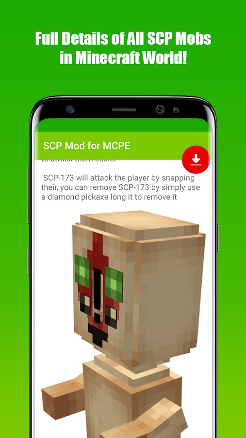 Это приложение содержит множество персонажей из вселенной SCP, таких как SCP-173, SCP-049, SCP-682, SCP-096, SCP-939, SCP-035 и другие. У каждого моба есть своя характеристика. Если вы поклонник SCP Foundation, то этот аддон для вас!