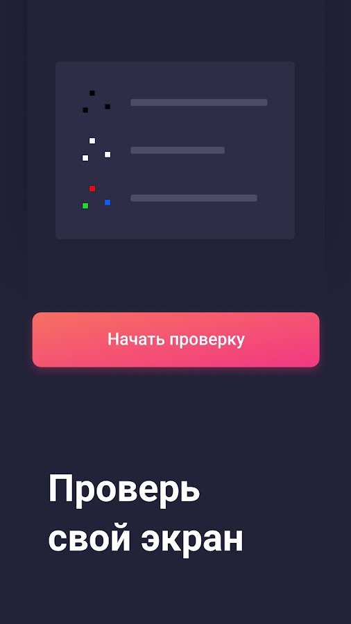Проверьте свой дисплей на битые пиксели или засветы с помощью Screen Check. Абсолютно бесплатное приложение для тестирования экрана. Подготовлено для смартфона и планшета.
