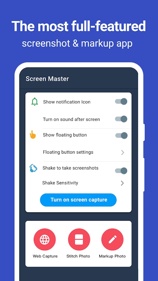 Screen Master — это простой в использовании инструмент для разметки снимков экрана и фотографий, не требующий рут-прав. С помощью Screen Master вы можете делать снимки экрана, касаясь плавающей кнопки или встряхивая устройство, что позволяет легко делать снимки экрана на планшете, телефоне или другом устройстве Android!