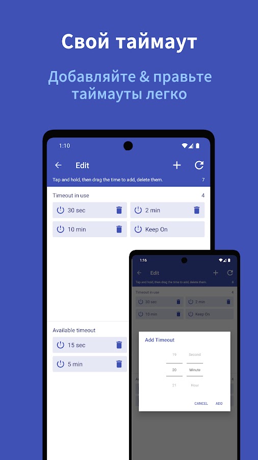 ● Добавление и удаление пользовательских времен выключения экрана
