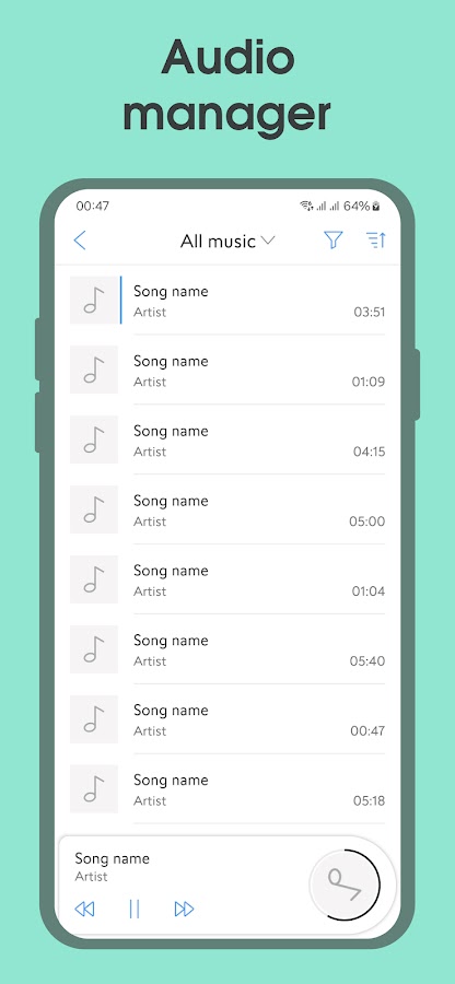 Найдите и просмотрите все звуки на вашем устройстве или SD-карте. Слушайте музыку в высоком качестве в фоновом режиме, регулируйте скорость и высоту звука музыкального проигрывателя.