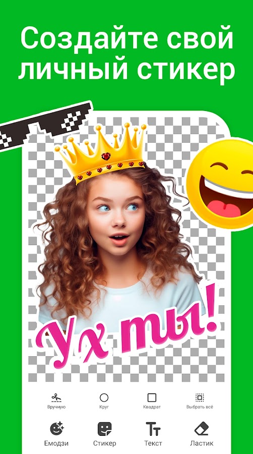Создавайте стикеры легко с помощью этого конструктора стикеров. Удалите фон изображения 📷, добавьте текст 📝, смайлики 😊, стикеры и многое другое.