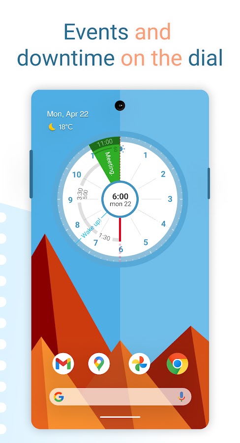 Список ваших дел и задач (события Google), календарь часы — отображает в виде круговой диаграммы в приложении и на виджете устройства.