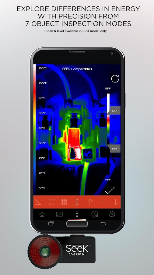 Приложение Seek Thermal является наилучшим средством для практического исследования и визуализации тепловой энергии независимо от вашего местоположения – в дороге, на работе, внутри или снаружи помещения. С помощью этого бесплатного приложения и термовидеокамеры Seek вы можете быстро и точно определять, исследовать, измерять и визуализировать тепловую энергию на своем смартфоне или планшете.