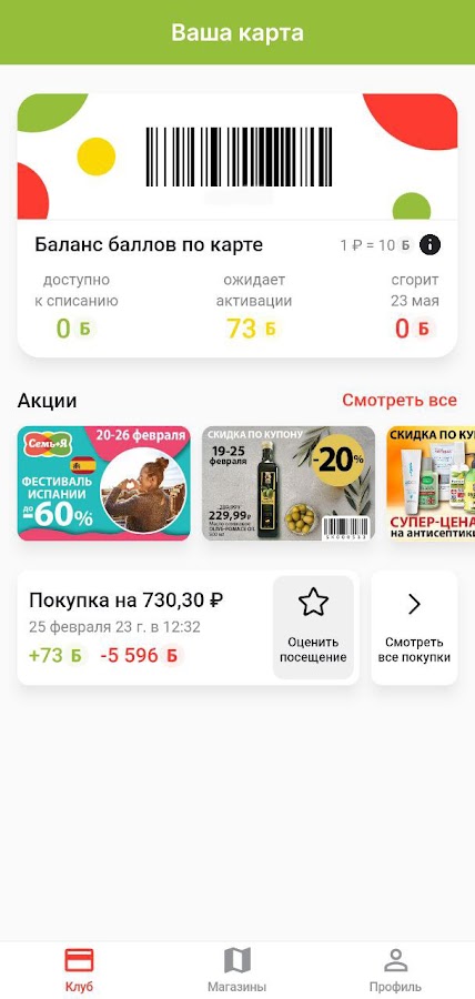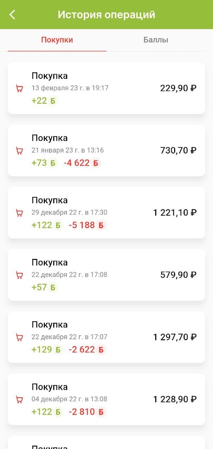 Баланс баллов. За каждую покупку по карте лояльности вам начисляется кэшбэк. Следить за начислениями и списаниями баллов стало намного проще.