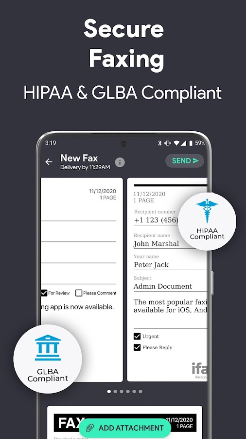 Приложение «Факс» соответствует требованиям HIPAA и GLBA, все документы защищены с помощью SSL-шифрования. Это делает приложение подходящим для рабочих процессов в сфере здравоохранения, юриспруденции и бизнеса, требующих высоких стандартов безопасности и конфиденциальности данных.