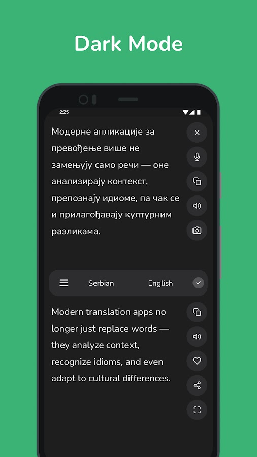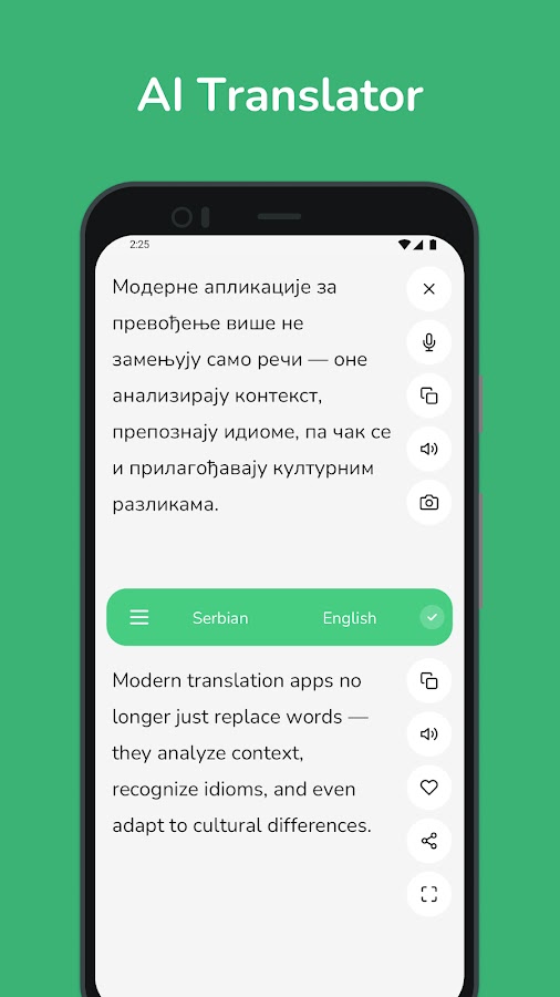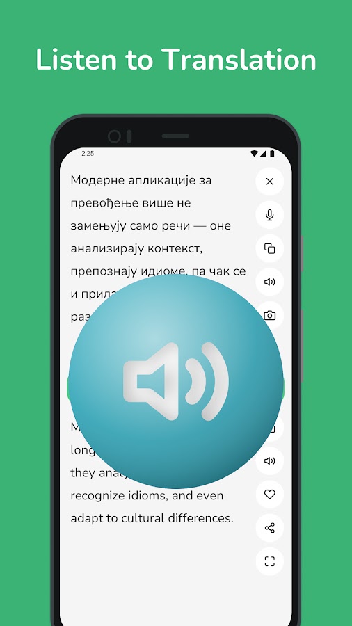 • Распознавание голоса: говорите прямо в приложении, и наш искусственный интеллект мгновенно переведет вашу речь, делая разговор более плавным.