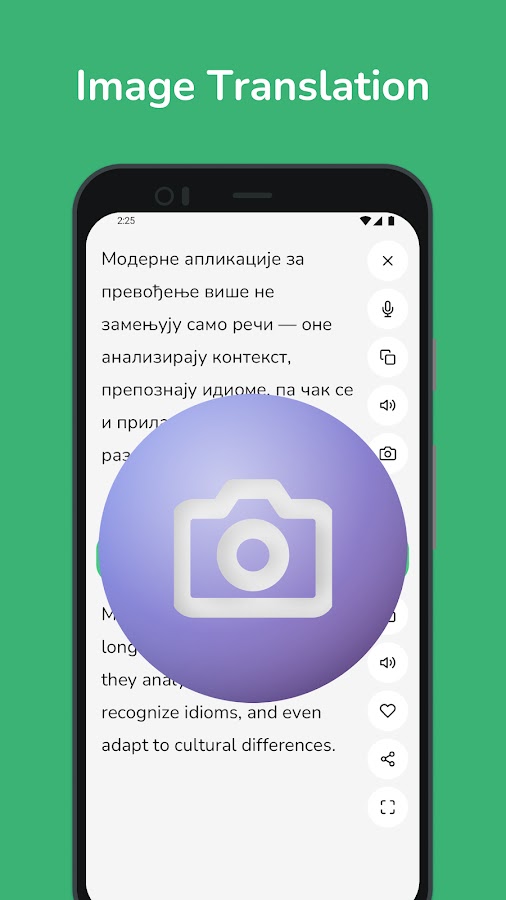 • Распознавание текста по изображениям: сделайте снимок или загрузите изображение, а затем мгновенно извлеките и переведите текст — идеальное решение для вывесок, документов или любых печатных материалов.