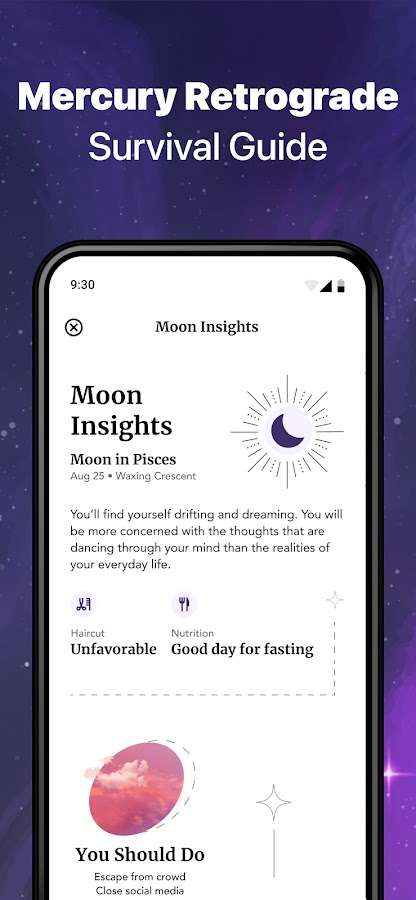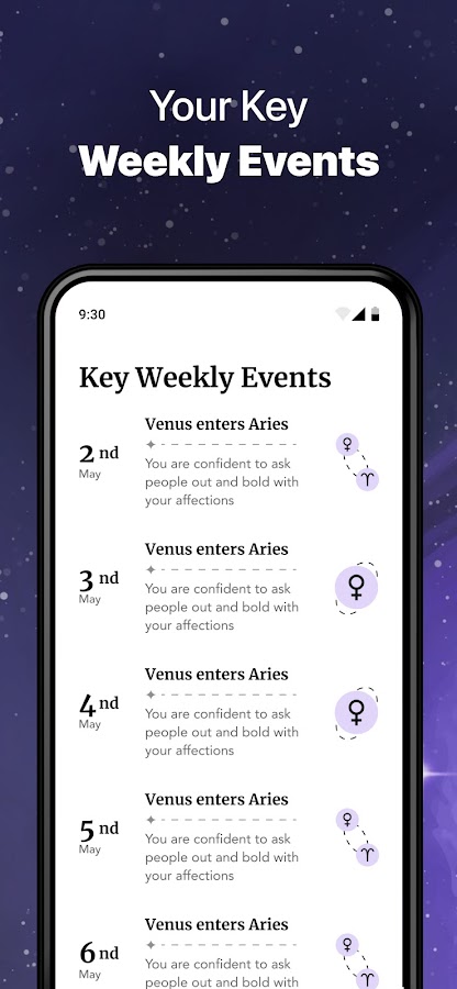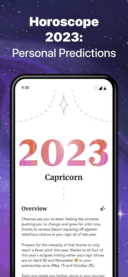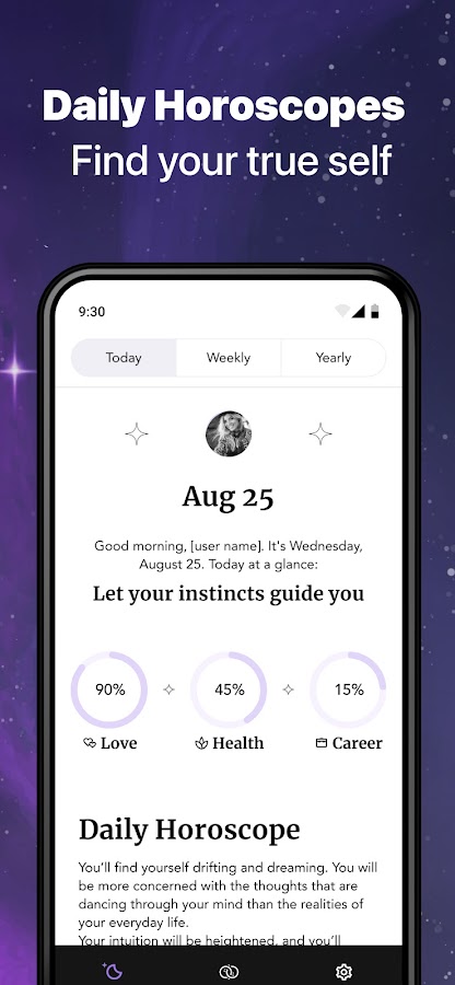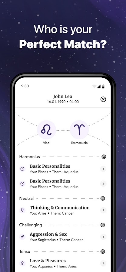 Приложение работает как натальная карта, раскрывая зашифрованную информацию в дате и месте вашего рождения. Узнайте, что вас ждет в личной жизни, карьере, путешествиях и других сферах жизни. Изучите тонкости вашего знака зодиака, и проверьте совместимость с другими знаками. Пройдите тест на совместимость с вашей второй половинкой.
