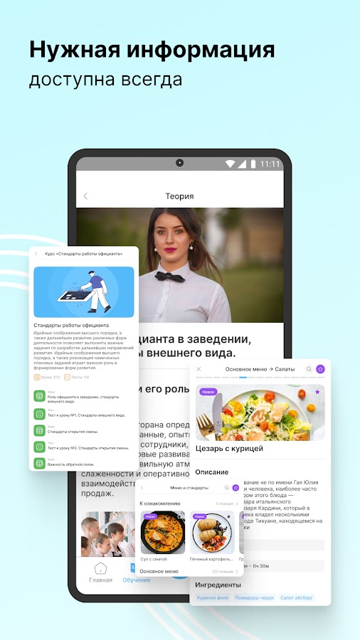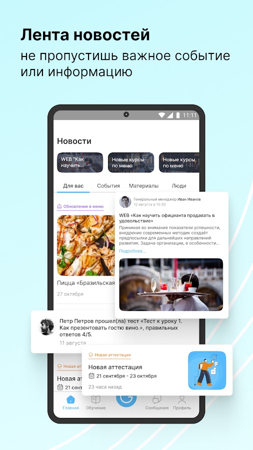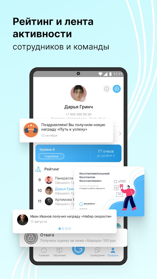 Платформа ServiceGuru позволяет построить обучение сотрудников через мобильный телефон. В приложении удобно структурированы учебные материалы – ассортимент, меню, библиотека знаний, тесты. Встроенный конструктор создания учебных курсов, дает возможность вам создавать учебный контент за считанные минуты. Загружайте в ServiceGuru видеоролики, аудиозаписи, презентации, документы, файлы любого формата. Функция аналитики и отчетности сокращает время на обработку результатов аттестации. Внутренняя система рейтингов и игрофикация делает процесс обучение более эффективным. Push-уведомления и чаты позволяют держать всех сотрудников в едином информационном поле, а общение с сотрудниками возможно без использования мессенджеров. Благодаря ServiceGuru обучение сотрудников и адаптация проходит быстрее и эффективнее.
