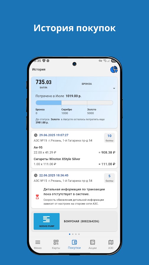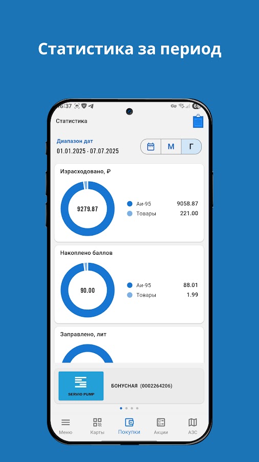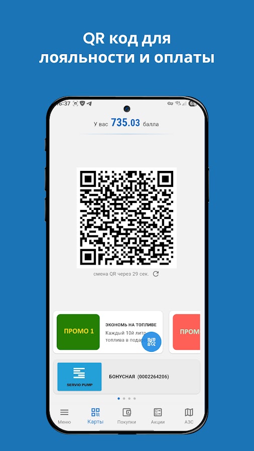 • Вместо карт предъявляйте динамический код на экране смартфона на всех зарегистрированных АЗС с установленной АСУ Servio Pump.