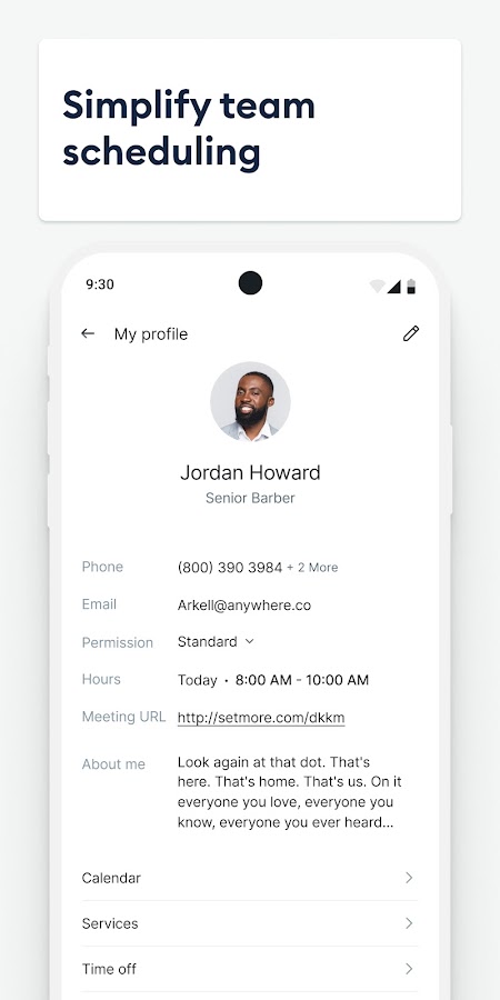 Загрузите мобильное приложение Setmore прямо сейчас и планируйте встречи, отправляйте напоминания, получайте оплату и управляйте своим расписанием где угодно. Идеально подходит для владельцев салонов, парикмахеров, механиков, медицинских работников, личных тренеров, специалистов в сфере торговли и любого бизнеса, связанного с услугами.