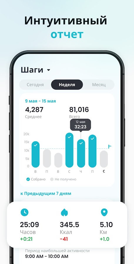 Получайте представление о вашем уровне активности с подробными графиками, показывающими шаги, время ходьбы, расстояние и сожженные калории. Вы можете просматривать данные по дням, неделям или месяцам и понимать, когда вы наиболее активны, а также тенденции в тренировках.