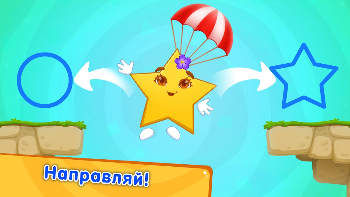 Чем дальше в игру — тем интереснее задания! Приземляемся с геометрическими фигурами на парашютах в нужные места на земле. Такие места выделены контуром подходящей фигуры, поэтому малышам нужно распределять их в соответствие с контуром.