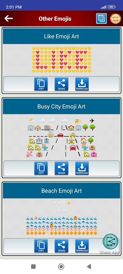 Emoji Art Sharing & Copy Paste App приносит вам последние и множество популярных Emoji, чтобы выразить свои эмоции очень смешно. В этом приложении вы найдете различные типы Emoji как Animal Birthday Food Fun Girls Good Morning Good Night Love Heart Miss You SMS спорт и т.д. Это бесплатное приложение для Android предлагает вам новый способ выразить свой гнев Любовь Счастья для ваших друзей и членов семьи с широкое разнообразие Emoji текста искусства. С помощью этого приложения вы можете просто скопировать и вставить, чтобы отправить выбранный Emoji, чтобы выразить свои чувства.