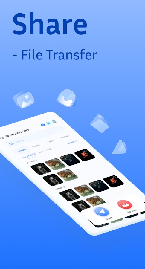 ✔️ Передавайте файлы любого типа, не изменяя оригинал: делитесь видео, делитесь музыкой в формате mp3, делитесь фотографиями, делитесь MV, делитесь файлами PDF, DOC,