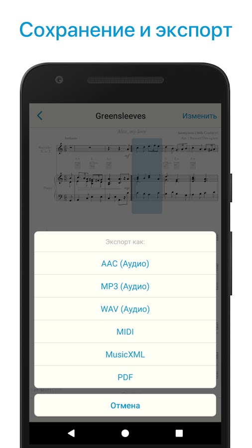 • Экспорт в формате MIDI, MusicXML, аудио (M4A/AAC, MP3, WAV) и PDF в облачное хранилище *, или непосредственно в другие приложения