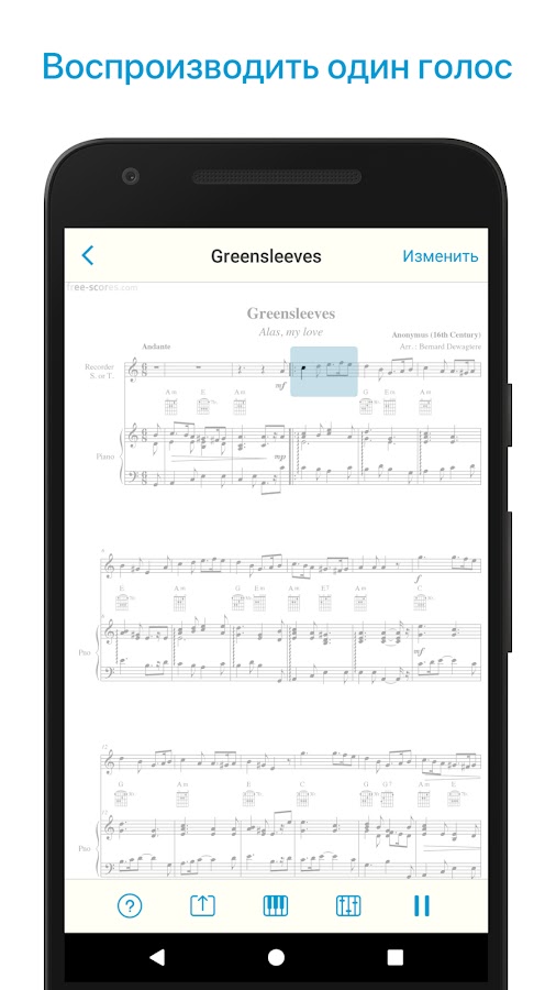 • Воспроизведение из любого места в мелодии — просто коснитесь такта, а ноты и символы будут подсвечены по мере их воспроизведения