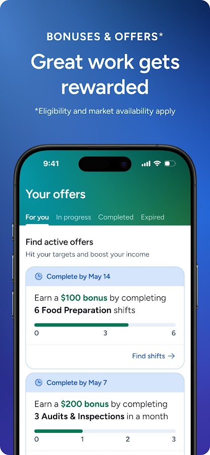 • ИЗУЧАЙТЕ НОВЫЕ НАВЫКИ — во время работы в смену вы приобретете новые и ценные навыки, которые пригодятся вам в различных сферах деятельности. Выбирайте из множества возможностей для неполного рабочего дня, доступных в вашем непосредственном районе, включая мерчандайзинг в магазине, пополнение запасов продуктов, уборку магазина, аудит, тестирование продукции, приготовление пищи и многое другое.