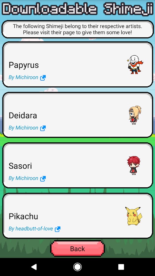 Если у вас есть набор изображений Shimeji, чтобы внести свой вклад и хотели бы, чтобы добавить его в это приложение, пожалуйста, напишите разработчику на xerophi@gmail.com. Все взносы Shimeji приветствуются и оценили.