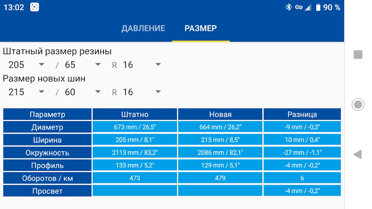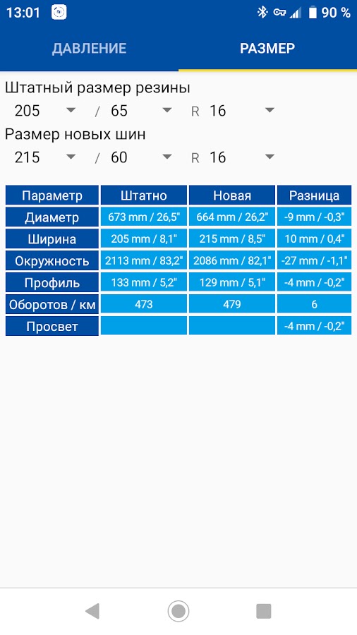 Простой шинный калькулятор с минимальным необходимым функционалом. Калькулятор позволяет рассчитывать оптимальное давление для конкретных шин, установленных на конкретный автомобиль. Кроме того есть возможность посчитать изменения параметров при переходе с одного размера резины на другой.