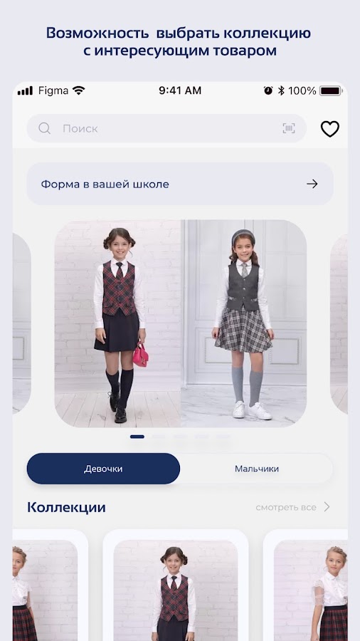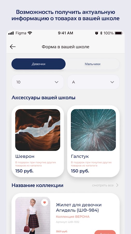 В приложении доступны индивидуально подобранные комплекты школьной формы для Вашей школы, класса.