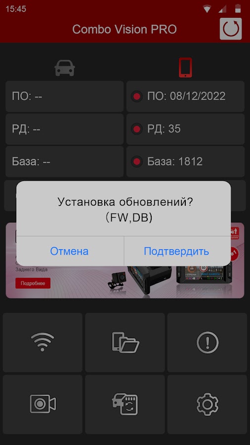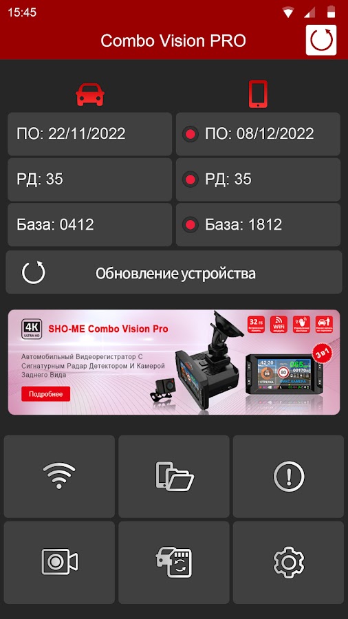 Приложение позволяет обновлять ПО (прошивка и база) через WiFi, а также просматривать видео, регулировать настройки и другие полезные действия.