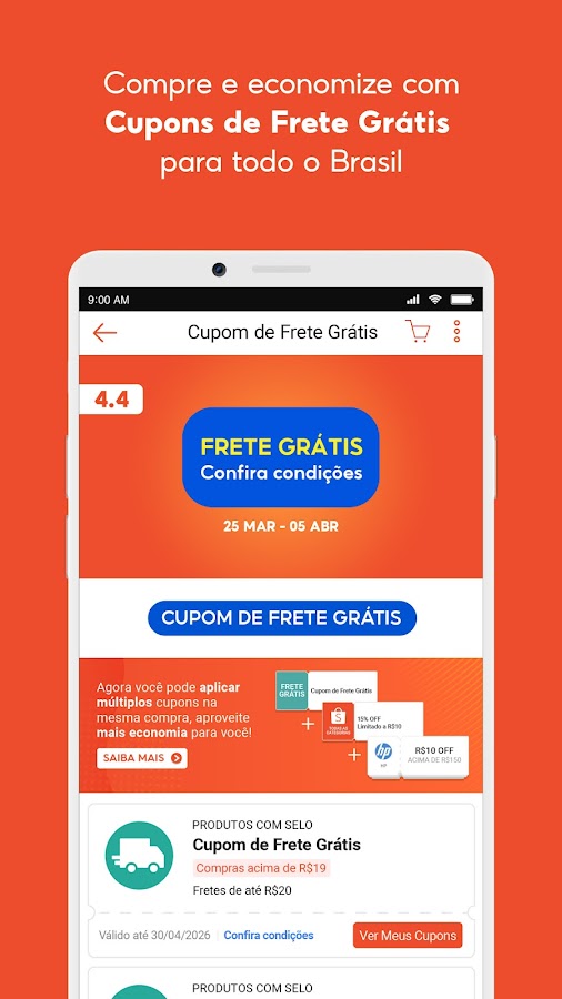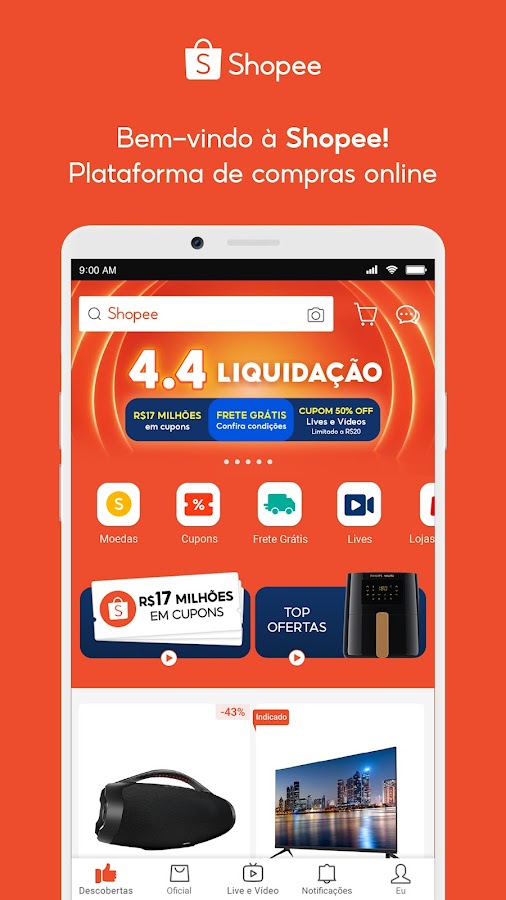 Воспользуйтесь преимуществами: купоны на скидку в размере 17 миллионов R$, эксклюзивные предложения, купоны на скидку 50% на видео и прямые трансляции, а также бесплатная доставка* (условия бесплатной доставки и минимальная сумма покупки указаны в приложении).