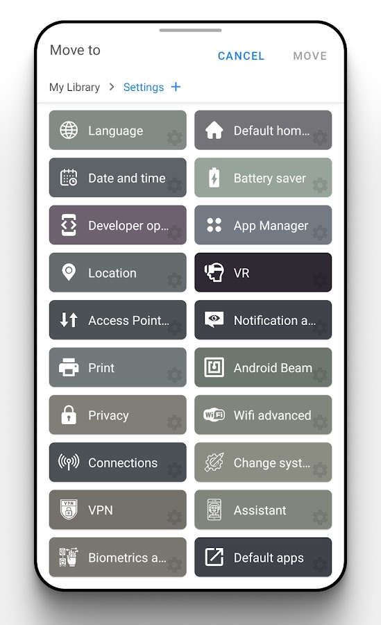 Создавайте ярлыки для часто используемых системных настроек, таких как Wi-Fi, Bluetooth, Экран, Звук, Локация и многие другие. Больше не нужно копаться в меню настроек!