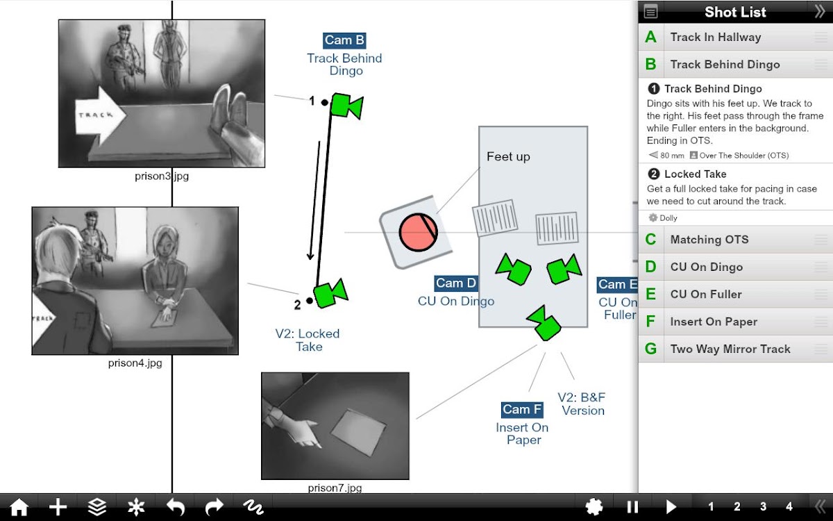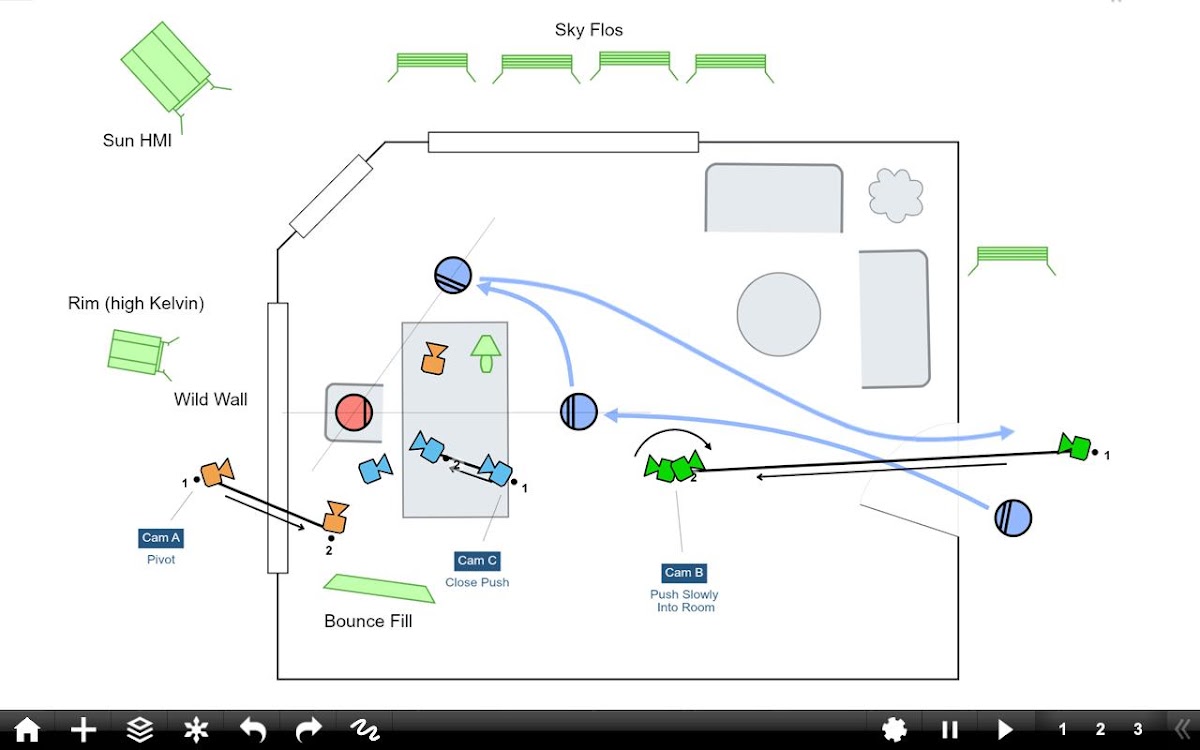 Shot Designer — это новаторский инструмент для директоров и ДП, который создает анимированные диаграммы камер с интегрированным списком кадров, раскадровками, видоискателем профессионального директора и синхронизацией и совместным использованием команды через облако Hollywood Camera Work без дополнительной платы.